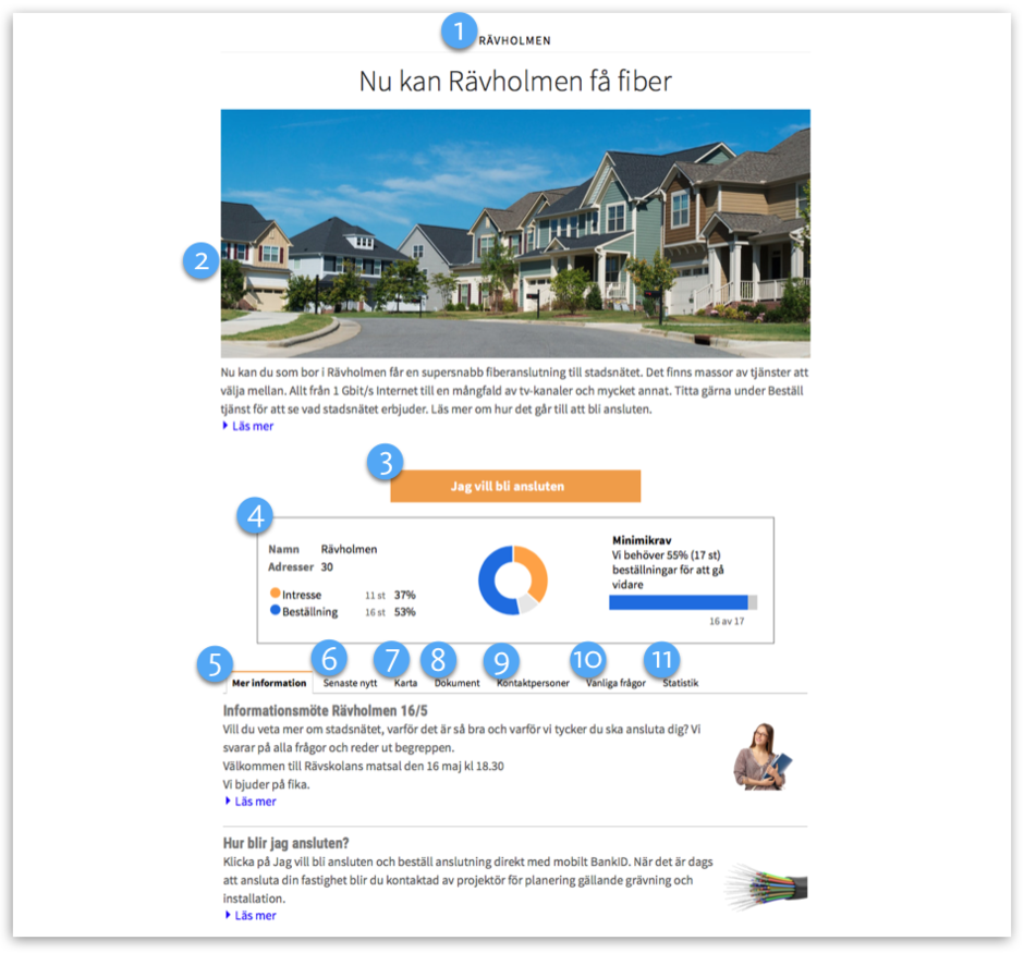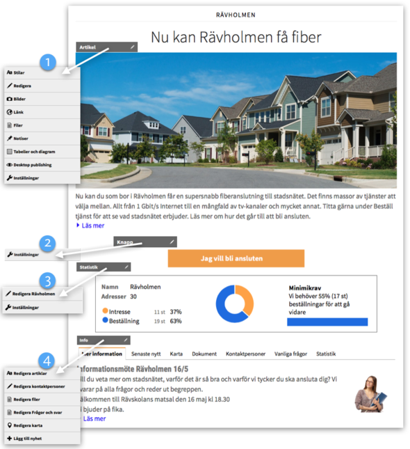 - Här redigerar du allt som visas i flikarna. Du kan bl.a. lägga till kontaktpersoner, nyheter, dokument och välja vilka Vanliga frågor som ska visas
