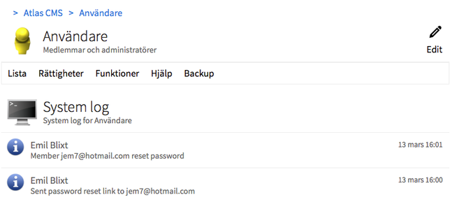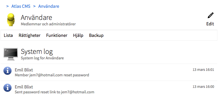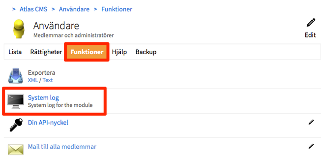 Likadant inne i Admin för en modul så ser ni under funktioner en länk till en systemlog för den modulen.