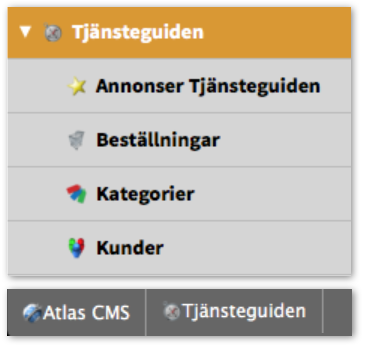 Klicka på Atlas CMS för att komma till listan med moduler eller gå till er Tjänsteguide och klicka på länken nere i adminlisten. Klicka därefter på Tjänsteguiden i listan för att öppna modulens funktioner i högerspalten och för att fälla ut undermoduler.