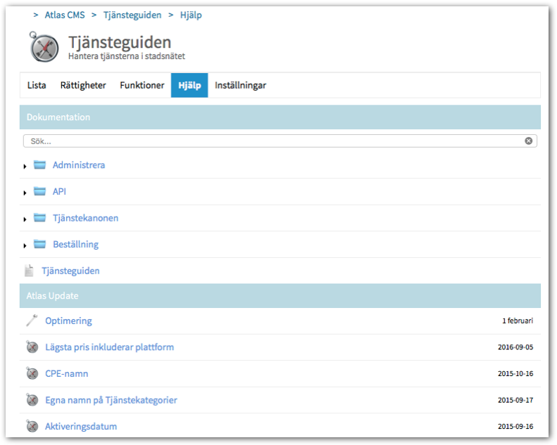 Under fliken Hjälp har vi samlat all dokumentation och alla updates som rör Tjänsteguiden.Du kan fortfarande klicka på Hjälp-länken längst ner till höger i Adminlisten, och får då en popup-lista med alla moduler. Välj aktuell modul och en dokumentationsartikel så visas denna i ett nytt fönster. Ett bra alternativ när man inte vill klicka bort sig från sidan man jobbar på.