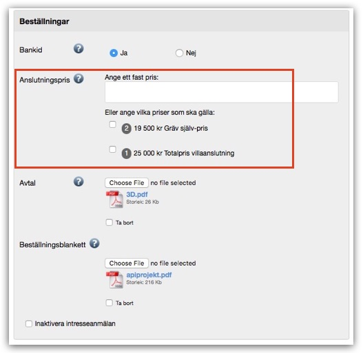 För att teckna ett avtal via BankID kan man ange ett anslutningspris, antingen generellt för området (i objektets inställningar) eller specifikt för utvalda adresser (via Price-fältet i adressdatabasen).