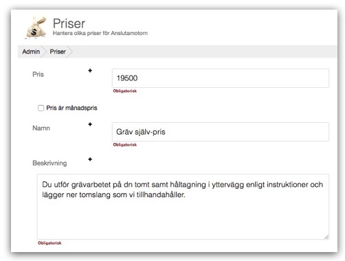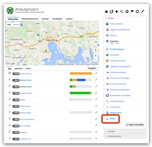 Vissa stadsnät har alternativa priserbjudanden för en villakund. Exempelvis ett grundpris för hela anslutningen och ett lägre pris om villaägaren gråver själv. För att hantera alternativa priserbjudanden har vi skapat en tilläggsmodul i Anslutmotorn som heter Priser, där stadsnätet lokalt kan definiera ett antal prisvarianter i en databas. Modulen hittar du i Admin > Anslutamotorn. Säg till oss via Supportloggen så aktiverar vi modulen i din Anslutamotor.