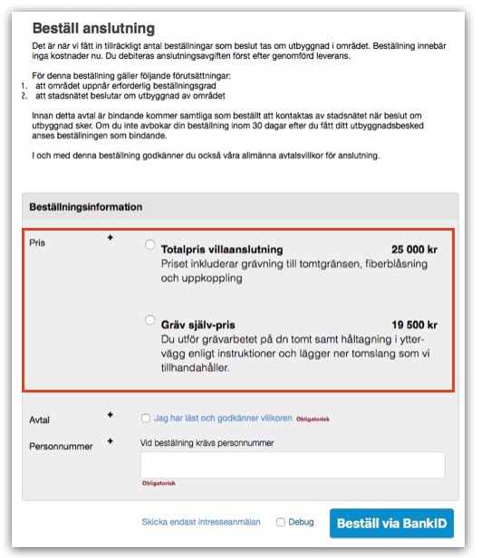 När kunden nu vill ansluta sig så visas de valda alternativen i beställningsinformationen och kunden väljer ett av dem. Det valda priset sparas i beställningsloggen och i bekräftelsen som skickas till kunden.