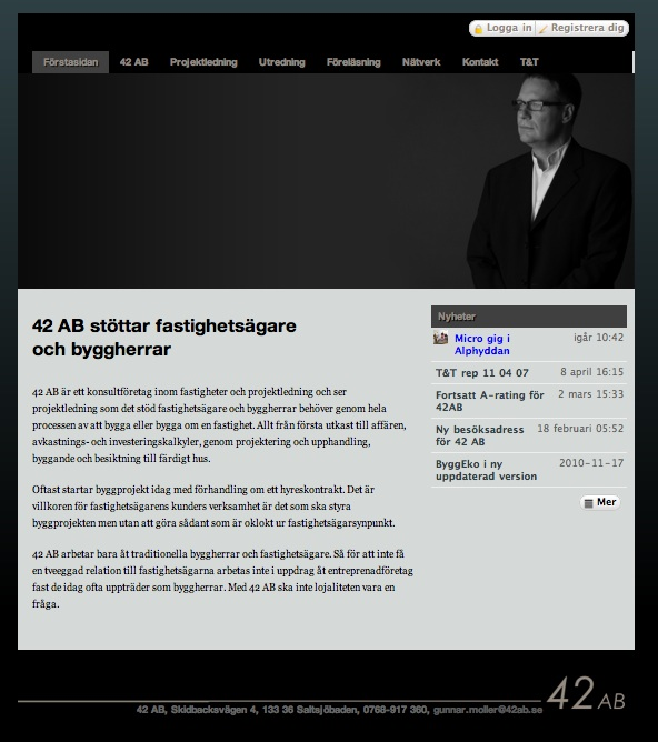 42 AB är ett konsultföretag inom fastigheter och projektledning och ser projektledning som det stöd fastighetsägare och byggherrar behöver genom hela processen av att bygga eller bygga om en fastighet. Allt från första utkast till affären, avkastnings- och investeringskalkyler, genom projektering och upphandling, byggande och besiktning till färdigt hus. Gunnar Möller behövde en stilren men enkel sajt för att informera sin marknad, en sajt som han själv enkelt kunde hålla levande.