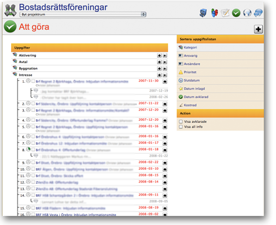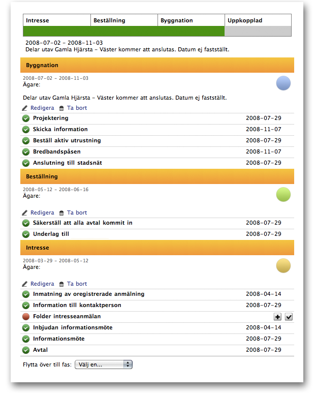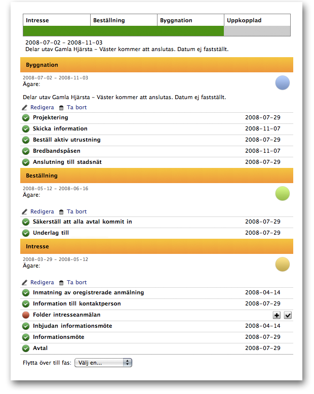 Efter att ha definierat anslutaprocessen olika faser och ingående aktiviteter för respektive målgrupp så lägger vi dem på webben i modulen Handlingsplanen. Efter att det är gjort så triggar varje intresseanmälan igång Handlingsplanen för det objektet och du kan enkelt styra och dela ut aktiviteterna till de som ingår i projektgruppen.